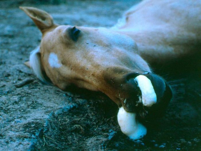 Диагноз. При постановке диагноза прежде всего учитывают эпизоотическую обстановку. Заболевание, как правило, появляется в теплое время года, и ему предшествует выпадение значительного количества осадков. Такие климатические условия способствуют интенсивному распространению насекомых - переносчиков вируса чумы лошадей. Присутствие большого числа однокопытных в местах появления болезни приводит к заражению новых групп восприимчивых животных и инфекция таким путем распространяется в ранее свободные от нее районы.