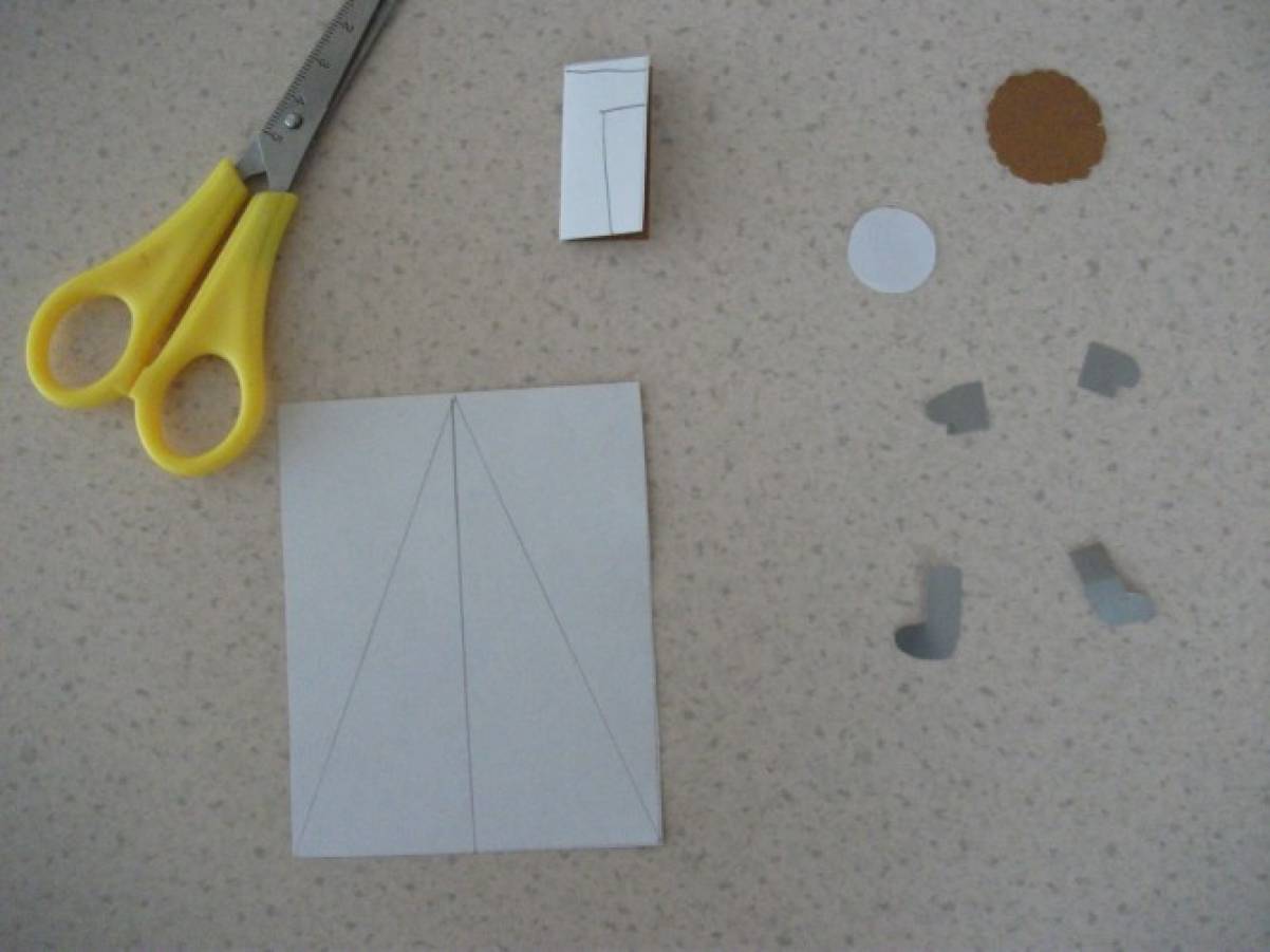 Из сложенного вдвойне квадрата коричневого цвета размером 4 X 4 см вырезаем одежду. Из белого и коричневого квадратов вырезаем круги диаметром 1 и 1,5 см. Из бумаги серого цвета вырезаем унты и варежки.