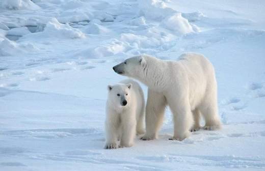 Когда медвежатам белого медведя исполняется 3 месяца самка покидает берлогу и вместе с ними отправляется кочевать по оледеневшим пустыням Арктики. Самка кормит медвежат молоком до 1,5 лет. Но совсем скоро детеныши белого медведя начинают самостоятельную жизнь. Белый медведь живет 25-30 лет. В неволе этот срок может быть и больше. Иногда белые медведи скрещиваются с бурыми. Рожденных гибридов называют – полярные гризли.