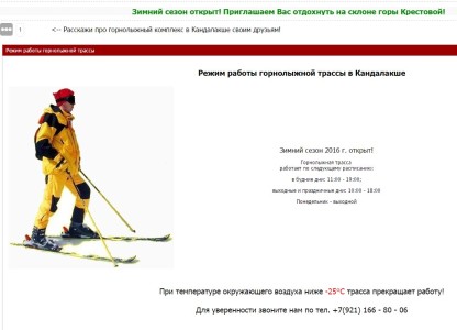 Горнолыжный курорт Кандалакша предлагает спокойный и размеренный отдых на природе. Здесь будет интересно новичкам в горнолыжном спорте. Маршруты на территории несложные, имеют отметку сине-зелёного цвета.