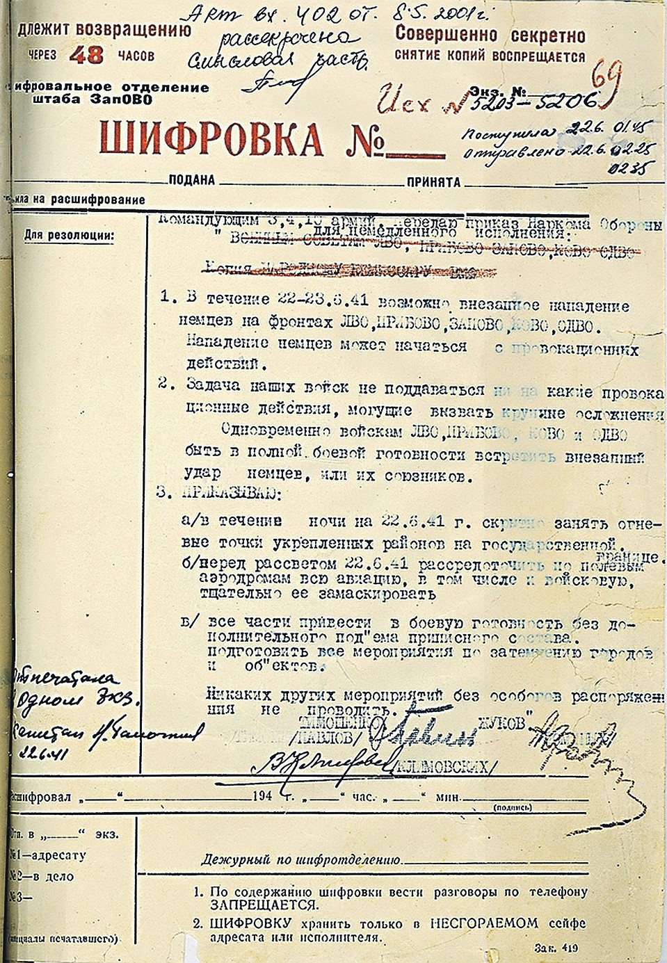 Еще 21 июня, вечером, Сталин дал поручение начальнику Генштаба Жукову и наркому обороны Тимошенко отправить эту директиву с целью привести войска приграничных округов в боевую готовность в связи с возможным внезапным нападением немцев утром 22 июня. Почему ее передачу в штабы округов закончили только в ночь на 22 июня? Почему только нарком ВМФ Кузнецов , получив шифровку, незамедлительно привел флоты в боевую готовность? Версий много.