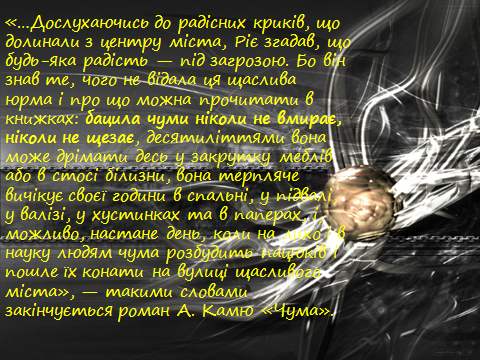 Учитель. У фіналі роману зазначено, що бацили чуми не щезнуть ніколи, отже і зло також н коли не залишить світ, але боротьба проти зла об’єднує людей, а найсильніше почуття, яке дає людям сили жити в абсурдному світі – це любов. І мені хотілось би, щоб ви про це пам’ятали.