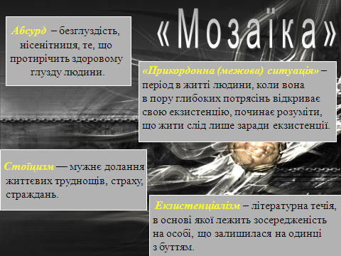 Словник термінів - Гуманізм- система поглядів ,які визначають цінність людини як особистості. - Екзистенціалізм- літературна течія , в основі якої лежить зосередженість на особі , яка залишилась наодинці з буттям. - Роман –притча – великий епічний твір із моральною повчальною ідеєю. - Хроніка – запис історичних подій у хронологічній послідовності. - Фатальність- невідтворність подій у світі. - Абсурд- безглуздя, нісенітниця.