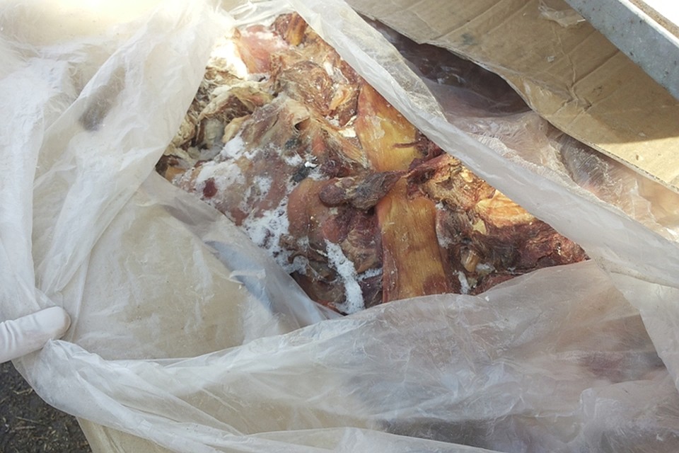 На территории хозяйства обнаружили коробку со свиными обрезями. Как позже выяснилось, продукцию привезли из карантинного региона по АЧС. ФОТО: пресс-служба Россельхознадзора по Иркутской области