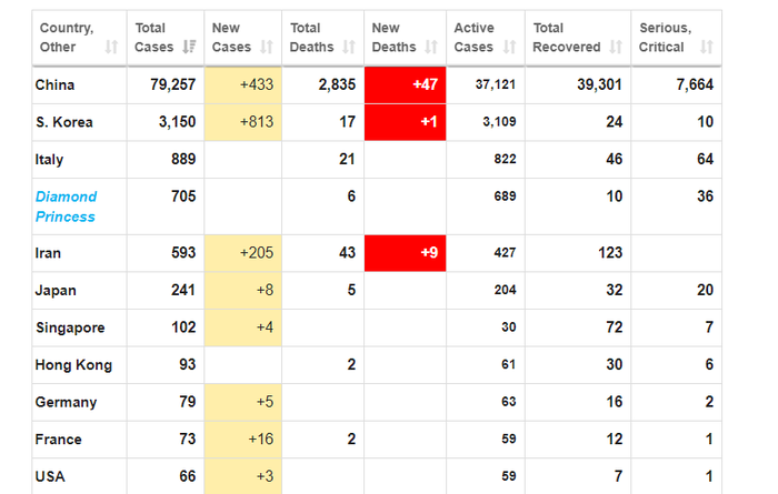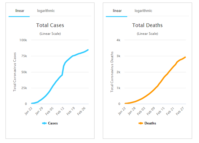 Блин, казалось, ещё несколько дней назад было около 40 тысяч заражённых, и всё шло к стабилизации ситуации. Помимо Китая, крупными распространителями теперь являются Южная Корея, Иран и Италия. Всего за прошлые сутки выявлено 1,529 носителей. Вчера WHO дала коронавирусу наивысший статус тревоги.