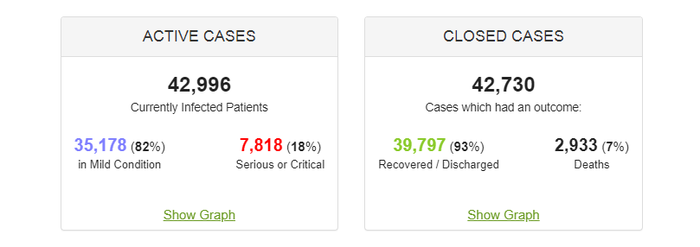 Смертность всё такая же, в районе 7%, но из ныне заражённых 18% в критическом состоянии.