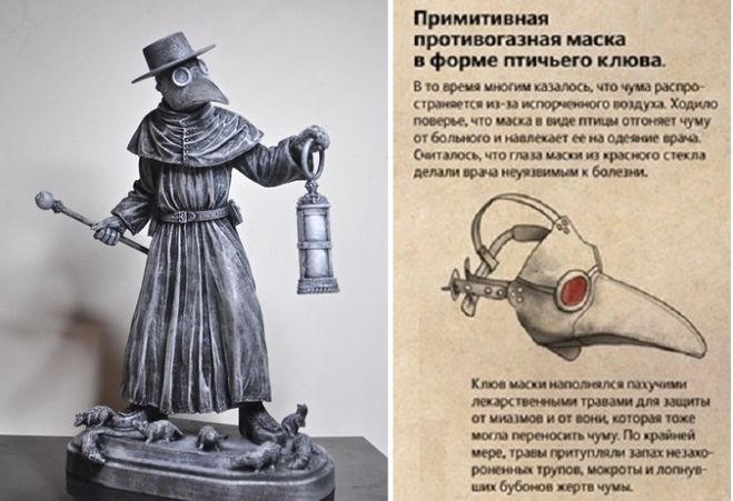 Люди облачались в защитные костюмы и надевали на лицо маску в виде птичьего клюва. Такое зрелище трудно забыть и самое главное, что оно не особо спасало от распространения эпидемии.