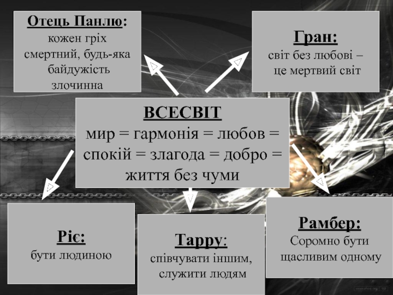 Людина - центр буття, це і є ідея екзистенціалізму. Роман "Чума" поставив людину у центр не тільки подій, викладених у формі хроніки, але й роздумів роману-алегорії. Камю створив роман-притчу, роман-пересторогу і попередження проти втрати моралі як запоруки самого існування людства.