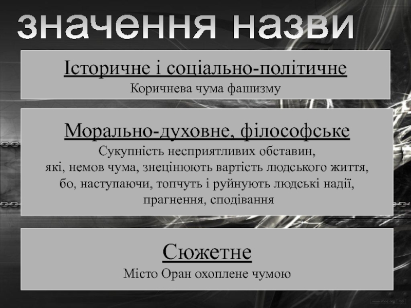 Хроніка вказує на дату 194. рік. Відтак на думку спадає словосполучення - "коричнева чума", тобто фашизм. Так вимальовується картина політичної чуми. Боротьба європейського Опору проти фашизму - такий смисл має на увазі автор у назві роману "Чума".