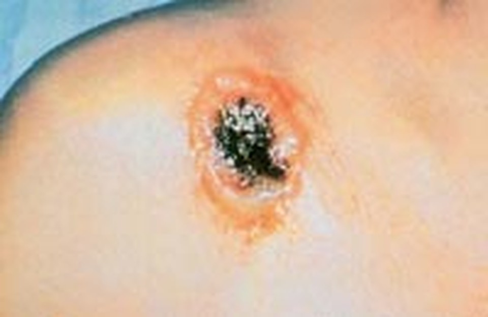 Как правило, появляется один карбункул, но в некоторых случаях развивается больше таких поражений – в сложных случаях до 20. На том месте, где инфекция попала в организм, сначала появляется красное пятно диаметром 1-3 мм, красно-синего оттенка. Оно похоже на укус насекомого. Через несколько часов на месте пятна развивается папула медно-красного оттенка. В это время беспокоит ощущение зуда и жжения. Примерно через день или немного раньше на месте папулы появляется пузырек с жидкостью. Она становится кровянистой. Когда больной чешется, пузырек лопается, иногда это происходит и самопроизвольно. На этом месте образуется язва, с приподнятыми краями, темным дном. Из нее отделяется серозно-геморрагическая жидкость. Язва постепенно увеличивается, и через сутки ее диаметр уже может достигать 15 мм. Вследствие некроза через 1-2 недели в центре язвы появляется черный плотный струп, похожий на уголь. Через 2-3 недели струп отделяется и на месте поражения появляется рубец.
