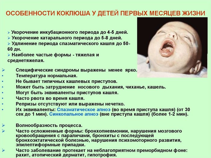 Особенностью инфекции является постепенное нарастание кашля в течение 2-3 недель после его появления. Коклюш нередко осложняется бронхитом, отитом. Пневмония является относительно распространенным осложнением; более редко возникают конвульсии и энцефалопатия.