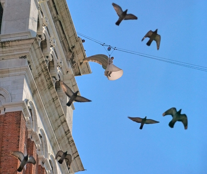 На площади св. Марка комедианты разыгрывали кукольные комедии, бродячие астрологи предсказывали будущее, крутились акробаты, загробным голосом разговаривали чревовещатели, патриции, разделившись на две команды играли в игру, напоминающую современный футбол - старались перебросить кожаный мяч на сторону противника. Между окнами дворцов натягивались канаты, по которым ходили канатаходцы. На этот же канат выпускали одного из заключенных: дойдет до конца - свободен, нет - его ждет веселая смерть "на миру".