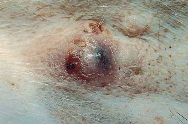 Фото 2 Опухоли волосяных фолликулов у собак и кошек. Мелкий пигментированный узелок. Обратите внимание на сходство с базальноклеточными опухолями, опухолями апокриновых желез и меланомой.