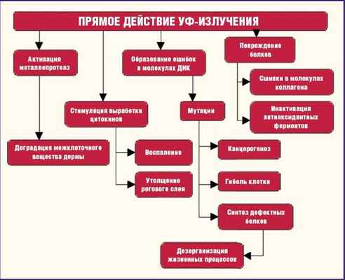 УФ-излучение запускает в коже фотохимические реакции, продуктами которых являются свободные радикалы и активные формы кислорода. Вступая в реакцию с другими биологическими молекулами - белковыми, липидными или молекулами ДНК - они передают тем свою активность. Превратившись таким образом в свободные и агрессивные радикалы, те, в свою очередь, начинают вступать в реакцию с окружающими их молекулами. При этом белки перекрестно связываются друг с другом, липиды биологических мембран окисляются, а в генетическом аппарате клетки возникают мутации. Свободные радикалы повреждают соединительную ткань дермы, кератиноциты, оказывают отрицательное воздействие на сосудистый аппарат кожи, усиливают все проявления фотостарения.