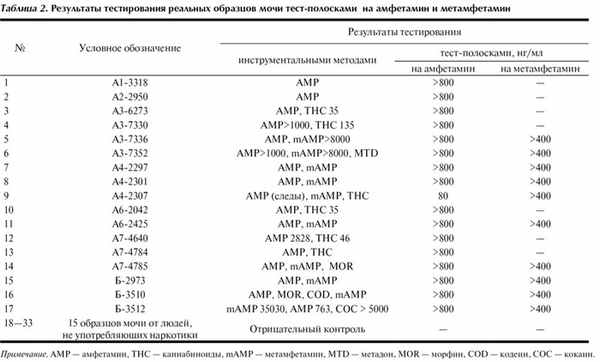 Проверка специфичности при больших концентрациях наркотических веществ проводилась на 17 образцах из химико-токсикологической лаборатории наркологической клинической больницы №17 Департамента здравоохранения Москвы. Отрицательный контроль тестировался на 15 образцах, заведомо не содержащих амфетаминов (табл. 2).