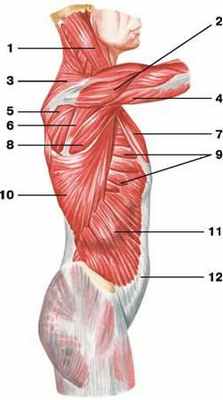1 — грудино-ключично-сосцевидная мышца; 2 — дельтовидная мышца; 3 — трапециевидная мышца; 4 — трехглавая мышца плеча; 5 — подостная мышца; 6 — малая круглая мышца; 7 — большая грудная мышца; 8 — большая круглая мышца; 9 — передняя зубчатая мышца; 10 — широчайшая мышца спины; 11 — наружная косая мышца живота; 12 — апоневроз наружной косой мышцы живота