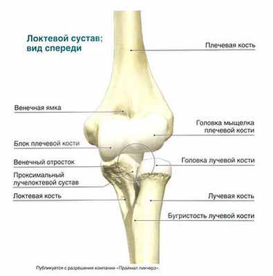 Локтевой сустав — это сочленение трех костей: плечевой, локтевой и лучевой. Плече-локтевой сустав относится к блоковидным, его образуют блок медиального мыщелка плечевой кости и полулунная вырезка локтевой кости. Увеличению площади суставной поверхности способствуют локтевой и венечный отростки, углубляющие полулунную вырезку. Плечелучевой сустав образован головкой лучевой кости и головкой мыщелка плечевой кости. Сустав между локтевой и лучевой костями образован головкой лучевой кости и лучевой вырезкой локтевой кости. Эти суставы вместе со связочным и мышечным аппаратом обеспечивают сгибание и разгибание в локтевом суставе, а также пронацию и супинацию предплечья.
