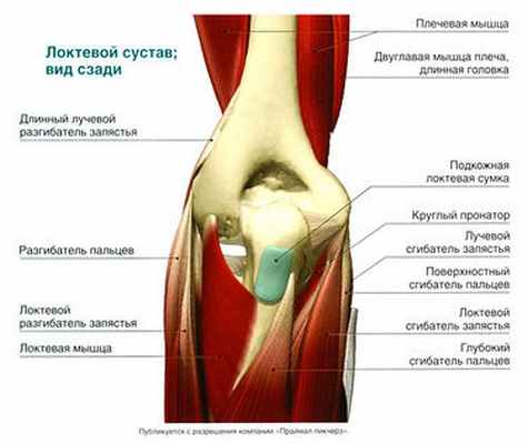 Место крепления сухожилий мышц плеча (бицепс и трицепс) наход ятся на лучевой и локтевой костях предплечья. Мышцы предплечья, которые отвечают за подвижность кисти и пальцев, так же крепятся в области локтевого сустава. Как и в случае других суставов, состояние хрящевой поверхности имеет большое значение для безболезненной подвижности в локте. Локтевой сустав окружает суставная капсула, синовиальная оболочка производит жидкость для улучшения питания хряща. Благодаря синовиальной сумки (бурс е ) многочисленные мышцы, сухожилия и связки в локте остаются подвижными по отношению друг к другу.