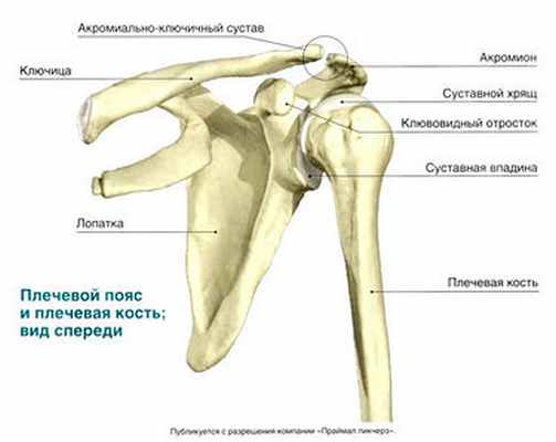 Часть тела от руки до основания шеи именуется плечом, состоит из ключицы, лопатки и плечевой кости. Окончательно плечевой сустав формируется к трёхлетнему возрасту. Он имеет шаровидную форму, лежит в капсуле, соединяется с плоской лопаткой. Она в 3 раза меньше сустава и почти неподвижна. Спереди и снизу на её поверхности нет мышц, имеются только связки, которые плохо растягиваются, поэтому частыми травмами в этой области являются разрывы и вывихи.