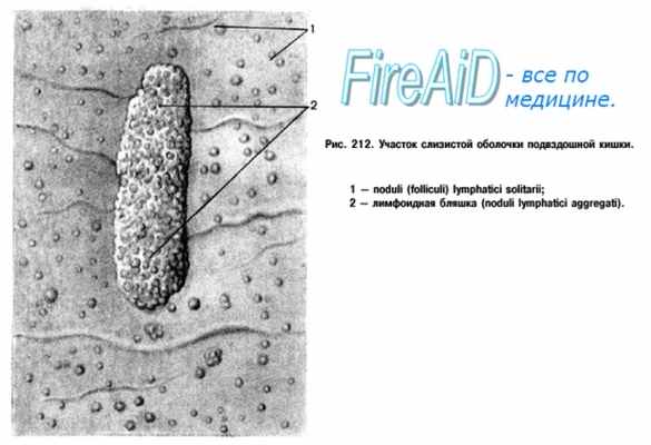 В собственном слое слизистой оболочки находятся скопления лимфоидной ткани, образующие одиночные, jolliculi lymphatici solitarii, и групповые, folliculi lymphatici aggregati, лимфатические фолликулы. Одиночные фолликулы диаметром 0,5-3 мм распределены более или менее равномерно по всей длине тонкой кишки. Общее их количество у детей достигает 15000 и уменьшается в старости. Групповые фолликулы - крупные скопления лимфоидной ткани (длиной от 2 до 12 см, шириной 1-3 см), как правило, находятся в слизистой оболочке подвздошной кишки напротив места прикрепления брыжейки. Количество их у детей около 50, у взрослых 2-30, у стариков - 10-15. Единичные групповые фолликулы могут быть в тощей и даже двенадцатиперстной кишке.