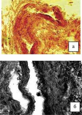 Рис. 2. Кровоизлияния в области краев атеросклеротических бляшек. Спазм коронарной артерии. Патологическая извитость эластических волокон. а — в боковом свете; б — фазовый контраст. Окраска гематоксилином и эозином. Ув. 200.
