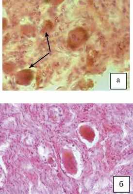 Рис. 1. Яремный ганглий системы блуждающего нерва. а — атрофические изменения ганглиоцитов с накоплением в них бурого пигмента и кариолизисом в части клеток; б — кариолизис в ганглиоцитах с формированием клеток тканей.