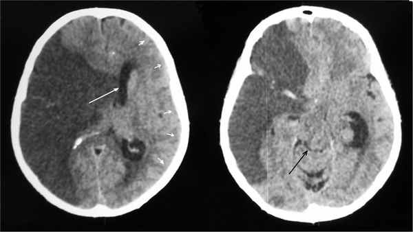 Рис. 5. КТ головного мозга больного 2-й группы с МИИ с благоприятным течением ДС (5-е сутки от начала заболевания, уровень бодрствования соответствует оглушению). Отмечается смещение срединных структур влево на 15 мм (белая стрелка). Отека левого полушария нет, конвекситальные субарахноидальные борозды не изменены (указаны малыми белыми стрелками), видна деформация охватывающей цистерны 1-й степени по классификации В.Н. Корниенко (черная стрелка).