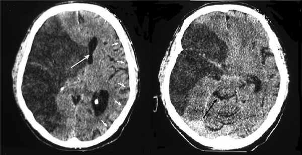 Восходящее транстенториальное вклинение: этот тип развивается в том случае, когда субтенториальное объемное образование (например, опухоль в задней черепной ямке, внутримозговая гематома) сдавливает ствол головного мозга, что приводит к формированию множественных ишемических очагов в стволе.