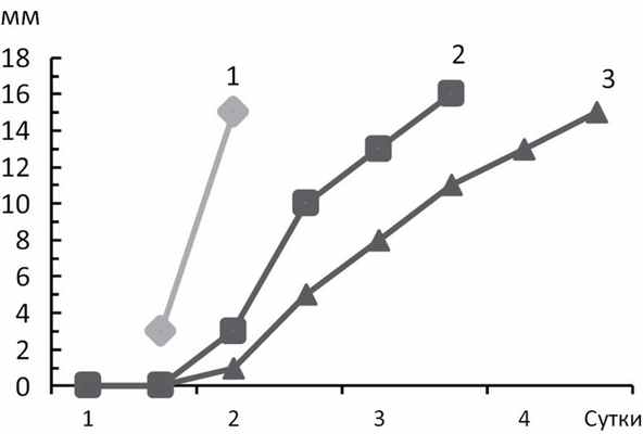 Рис. 1. Динамика латеральной дислокации у больных с неблагоприятным типом ДС на 1—5-е сутки от начала инсульта. Кривая 1 — фульминантный вариант, кривая 2 — прогредиентный вариант, кривая 3 — отсроченный вариант. По оси ординат — величина дислокации (мм), по оси абсцисс — сутки от начала заболевания.