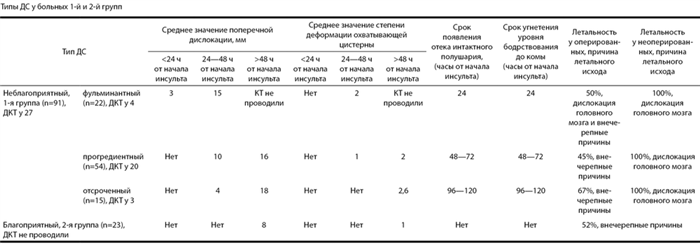У больных со злокачественным течением МИИ риск летального исхода от височно-тенториального вклинения определяется не только выраженностью, но и темпом развития поперечной дислокации срединных структур головного мозга. ДС у больных со злокачественным течением МИИ может протекать по благоприятному и неблагоприятному типам. При неблагоприятном типе темп развития ДС может быть фульминантным, прогредиентным и отсроченным. Неблагоприятный тип течения ДС является абсолютным показанием к ДКТ.