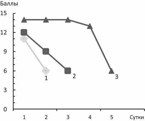 Рис. 3. Динамика уровня бодрствования у больных с неблагоприятным типом ДС на 1—5-е сутки от начала инсульта. Кривая 1 — фульминантный вариант, кривая 2 — прогредиентный вариант, кривая 3 — отсроченный вариант. По оси ординат — балл по шкале комы Глазго, по оси абсцисс — сутки от развития инсульта.