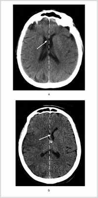 Рис. 2. КТ головного мозга больных с МИИ с фульминантным течением ДС. а — КТ больного П., 6 ч от начала заболевания. На фоне незначительного сужения конвекситальных субарахноидальных борозд левого полушария отмечено смещение срединных структур вправо на 4 мм (указано белой стрелкой, пунктиром показана средняя линия); б — КТ больного В., 8 ч от начала заболевания. На фоне незначительного сужения конвекситальных субарахноидальных борозд и минимальной гиподенсивности правого полушария отмечено смещение срединных структур влево на 2,5 мм.
