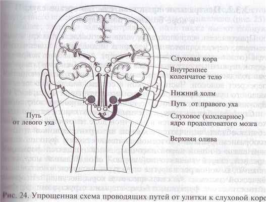 Итак, путь электрических импульсов от рецепторов органа слуха к слуховой коре больших полушарий головного мозга имеет 3 — 5 уровней переключения (переключательных станций) и не менее трех перекрестов (рис. 24).