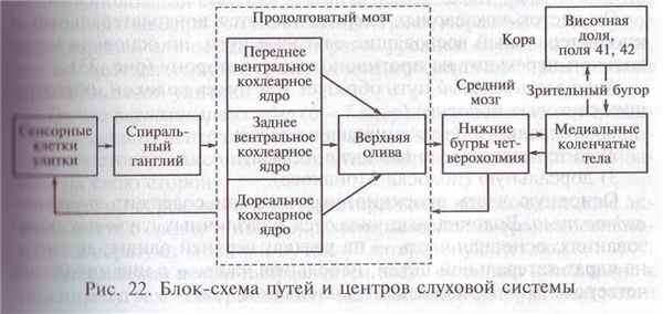 В работах С. Рамон-и-Кахаля дано описание классического слухового пути. Этот восходящий специфический (или афферентный) путь представляет собой несколько последовательных уровни (рис. 22):