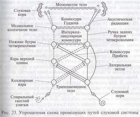 От клеток кохлеарных ядер начинаются контрлатеральный и ипсилатеральный восходящие слуховые пути, но основная масса волокон переходит на противоположную сторону (рис. 23).