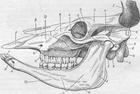I—резцовая кость; 2—носовая кость; 3—дорзальная челюсть; 4—слёзная кость; 5—лобная кость; 6—височная пластинка теменной кости; 7—височная кость; 8—затылочная кость; 9—скуловая кость; 10—вентральная челюсть; а—резцовые зубы; b—подглазничное отверстие; с—слёзное отверстие; d—глазничное отверстие надглазничного канала; е—венечный отросток; f—рог; g—наружный слуховой проход; h—мыщелок затылочной кости; i—яремный отросток; к—костный барабан; l—суставной отросток; т—сосудистая вырезка; п—подбородочное отверстие; о—лицевой бугор; р—резцовая часть вентральной челюсти; q—коренная часть вентральной челюсти.
