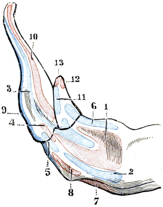 Ветви идут от концов тела в двух направлениях. В сторону гортани обращены большие рога, или гортанные ветви,—cornua maiora, или thyreo-hyoid (3). Они слегка сжаты с боков и соединяются со щитовидным хрящом гортани. К черепу от концов тела направлены более короткие малые рога — cornua minora, или keratohyoid (2). К этим рогам от каменистой кости спускаются длинные парные ветви из нескольких члеников: а) проксимальный членик—tympanohyoid (6)—соединяется с подъязычным отростком барабанной части каменистой кости; он представляет очень короткое, цилиндри-