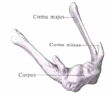 Большие рога отходят от тела кости по направлению кзади и кнаружи, Они тоньше и длиннее тела и имеют на концах небольшие утолщения.
