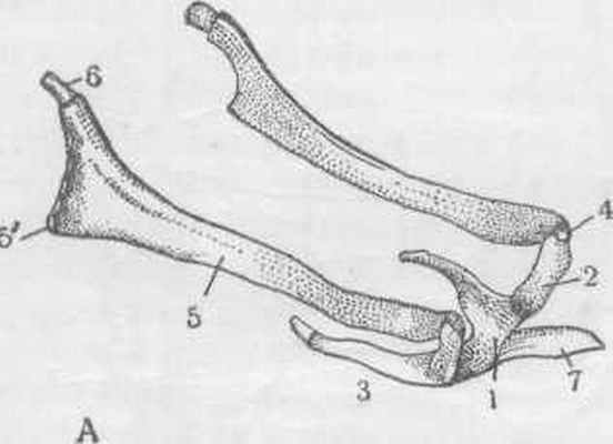 Парная подъязычная кость—os hyoideum (рис. 87—А)—располагается между ветвями вентральной челюсти и служит остовом для корня языка, глотки и прилежащей к ней гортани. Она имеет непарное тело—corpus — и парные ветви—rami.