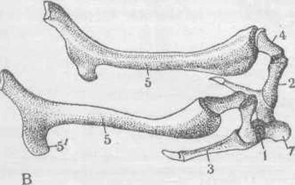 1—тело; 2—малые рога; 3—большие рога; 4—дистальный членик ветви; 5—средний членик; 5'—угол подъязычной кости; 6—проксимальный членик; 7—язычный отросток.