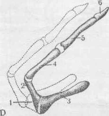 Рис. 87. Подъязычные кости: А—лошади, В—крупного рогатого скота, С—свиньи, D—собаки.