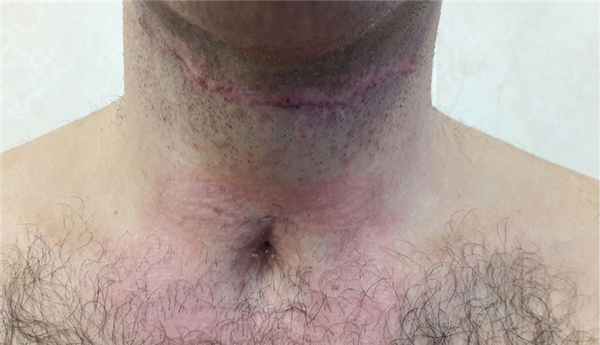 Послеоперационный период протекал гладко. Трахеостомическая трубка удалена на 7-е сутки, дыхание свободное. Назогастральный зонд удален на 10-е сутки. Рана зажила первичным натяжением. Больной выписан в удовлетворительном состоянии на 14-е сутки после операции. В отдаленном периоде (через 3 мес) проведен осмотр: на передней поверхности шеи послеоперационный линейный рубец и в типичном месте рубец после трахеостомии, признаков стеноза глотки, гортани и трахеи не обнаружено (рис. 4). Рис. 4. Больной С. через 3 мес после операции.