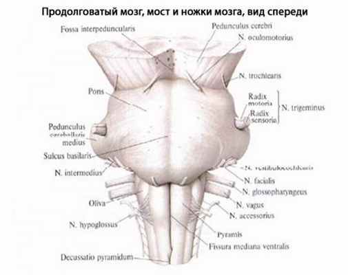 Продолговатый мозг (лат. myelencephalon, medulla oblongata ), или луковица головного мозга (лат. bulbus cerebri ), — задний отдел головного мозга, непосредственное продолжение спинного мозга. Происходит из ромбовидного мозга и входит в ствол головного мозга. Регулирует такие основные процессы жизнедеятельности, как дыхание и кровообращение, поэтому в случае повреждения продолговатого мозга мгновенно наступает смерть.