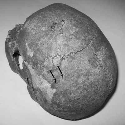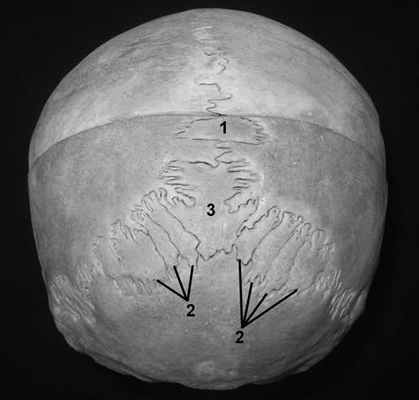 Рис. 1. Кость сагиттального шва (1), кости ламбдовидного шва (2),