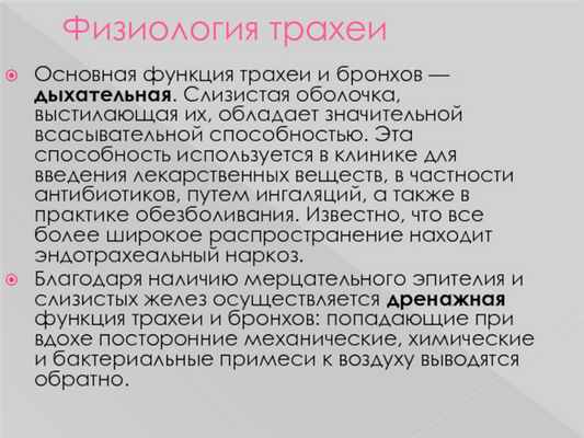 Основная функция трахеи и бронхов — дыхательная. Слизистая оболочка, выстилающая их, обладает значительной всасывательной способностью. Эта способность используется в клинике для введения лекарственных веществ, в частности антибиотиков, путем ингаляций, а также в практике обезболивания. Известно, что все более широкое распространение находит эндотрахеальный наркоз.