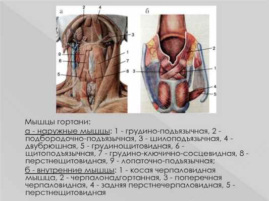 а - наружные мышцы: 1 - грудино-подъязычная, 2 - подбородочно-подъязычная, 3 - шилоподъязычная, 4 - двубрюшная, 5 - грудинощитовидная, 6 - щитоподъязычная, 7 - грудино-ключично-сосцевидная, 8 - перстнещитовидная, 9 - лопаточно-подъязычная;