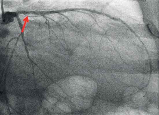 Консилиумом, состоящим из кардиологов, рентгенэндоваскулярных и сердечно-сосудистых хирургов, принято решение о проведении хирургического лечения. Перед операцией выполнена коронароангиография, выявлен стеноз 50% в устье передней нисходящей артерии (ПНА) (рис. 4).