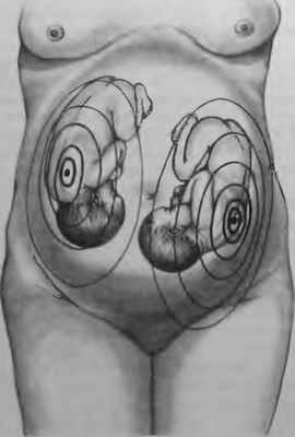 если близнецы находятся в продольном положении, на передней поверхности матки образуется продольное углубление; при поперечном положении обоих плодов углубление расположено горизонтально;