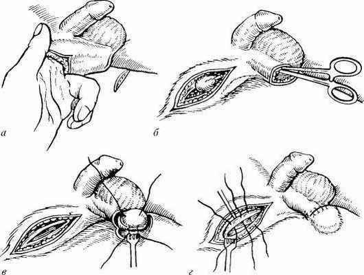 Лечение крипторхизма. При истинном крипторхизме уже на восьмом месяце жизни ребенка в неопущенном яичке начинаются дегенеративные изменения. К седьмому году жизни яичко может совсем прекратить функционировать. Поэтому лечение крипторхизма необходимо начинать уже в 2-3 года. При признаках эдокринных изменений назначаются гормональные препараты (хорионический гонадотропин). При отсутствии эффекта проводится хирургическое лечение. Оперативное лечение проводится в один или два этапа. При выполнении операции в один этап, яичко низводится в мошонку и с помощью толстой шелковой нити фиксируется к внутренней поверхности бедра. При выполнении операции в два этапа яичко низводится в мошонку и через разрез в мошонке фиксируется через разрез к широкой фасции бедра, разрез мошонки пришивается к разрезу кожи бедра. Через 2-3 месяца этот шов рассекается и яичко перемещается в мошонку. Вид операции определяется во время оперативного вмешательства. При своевременном выполнении оперативного лечения в сроки до трех лет, нормальная функция яичек сохраняется более чем в 85% случаев. При более позднем оперативном лечении положительный результат получают менее, чем у половины пациентов.