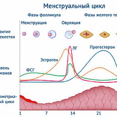 Ниже на рисунке представлен менструальный цикл, развитие яйцеклетки, изменения в эндометрии и изменение гормонального фона (по 4 гормонам) у здоровой женщины.